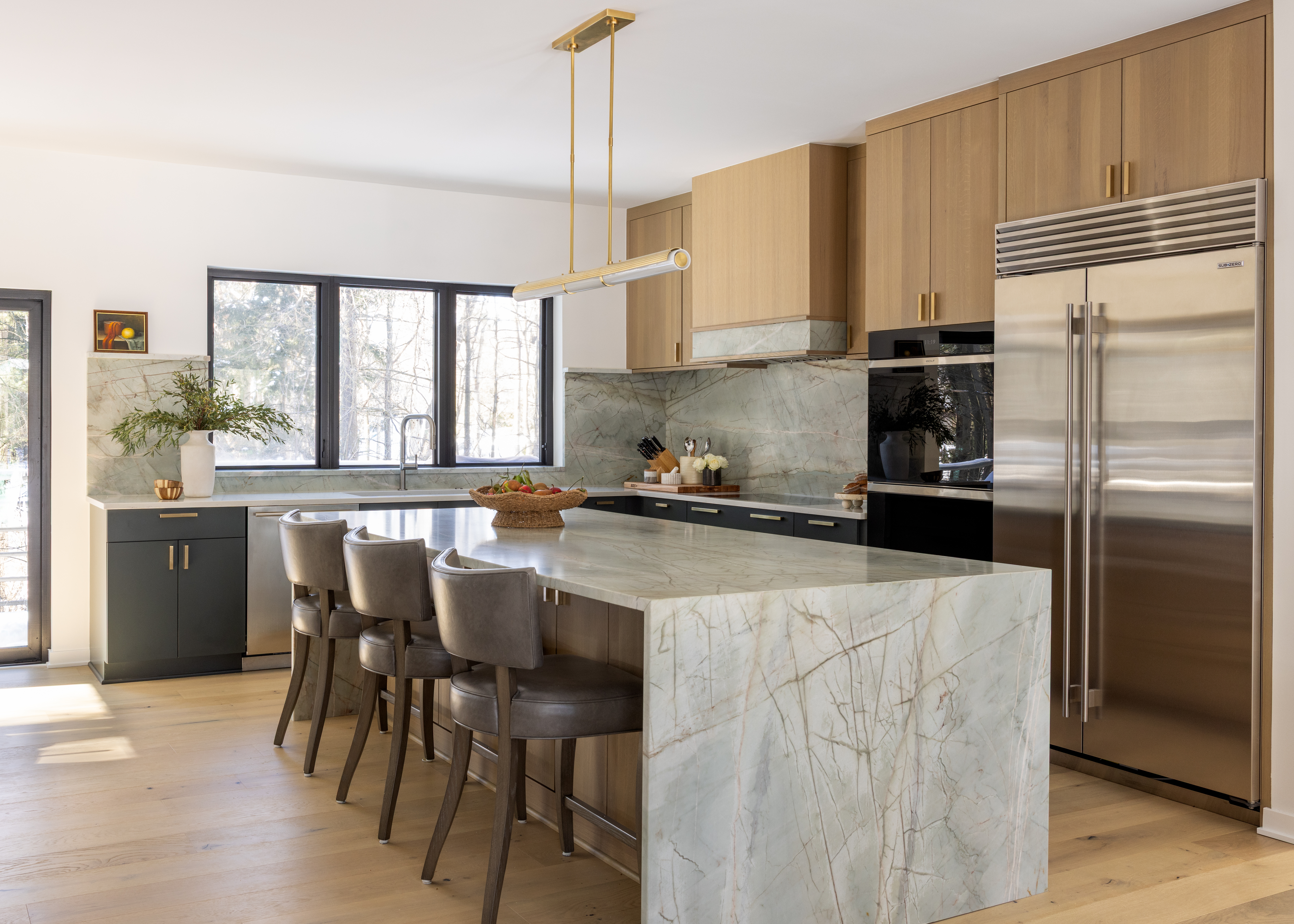 The kitchen, though spacious, once felt dated and cramped. By removing an old drop ceiling laundry/mudroom, the space was opened up to create a true centerpiece for the home. A new mudroom drop zone adds everyday storage, while a custom steel and glass butler’s pantry enclosure serves as both a functional workspace and a design feature. The dramatic quartzite waterfall island, paired with custom white oak cabinetry and dark painted lowers, anchors the room. A handcrafted hood and professional-grade Sub-Zero and Wolf appliances complete the transformation, echoing the natural landscape that surrounds the home.